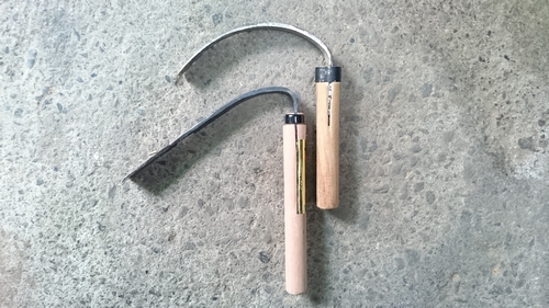 お客様の片手蓮根堀。 遠方から蓮根堀りを探して来られたお客様がいらっしゃいました。 お求めの蓮根掘り鍬が特殊な形状でしたので、少々お時間をいただき、鍛冶職人との相談の上お返事をさしあげるという事になったのですが、ついでに現在お客様がお使いの片手用の蓮根堀りの柄付けもという事でしたので、お預かりして柄付けをさせて頂きました。 写真の上部に置いてあるのがお預かりした鍬です。 そして下に置いてあるのが当店で取り扱っております片手蓮根堀になるのですが、並べると鍬の形状が全く違いますね。 柄の長さ、鍬の長さ、そして反り具合。 松山では昔から当店の鍬の形だったのですが、お客様がお持ちいただいた鍬の形も使い勝手が良さそうですよね。 当店でもこの形状の蓮根堀を取り扱いたいなぁと思っているのですが、どうやらこの綺麗なRになっている鍬の形は鉄の硬さが昔とは違って硬いため造るのは難しいらしく、上手く出来ないそう。 あまりに曲げると折れてしまうので、どうしてもカクカクになってしまうらしいのです。 鍛冶職人がこれ以上少なくなってしまうと、ロストテクノロジーになってしまう日も近いのではないかと危惧してしまいます。 どのような形状になるのかは分かりませんが、今の物より少し鍬の長さが短いものが出来上がりましたら、またご紹介させていただきます。