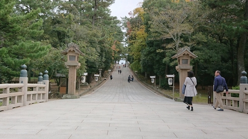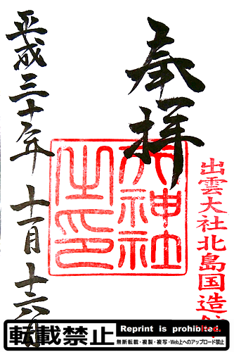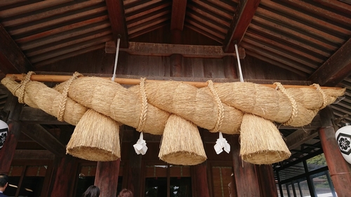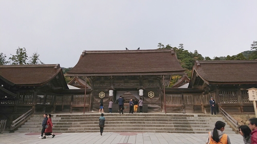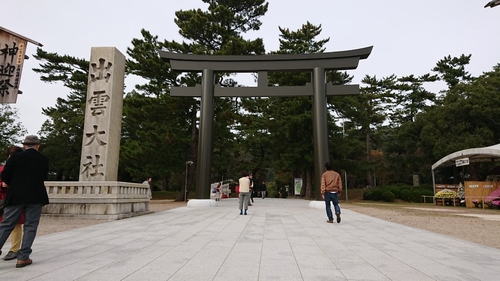 出雲大社。 言わずと知れた、泣く子も黙る出雲大社(いずもおおやしろ)。 旧暦の十月は全国から神様が出雲大社に集まるという事で、神迎祭が開催されていました。 長い参道が続いた先に見えてくるのが、あの有名な大注連縄です。 あまりにも立派なので間違えやすいのですが、こちらは拝殿。 本殿はその背後に鎮座しています。 出雲大社の拝礼作法は一般的な物とは違い、「二拝四拍手一拝」となっています。 このことからも別格感が漂います。 出雲大社横、神秘的な滝や池、美しい芝生が印象的な場所が出雲大社北島国造館。 こちらまで参拝する人が少ないのか、静かでゆっくりと散策が出来ました。 出雲の甘味と言えば「ぜんざい」。 こちらは紅白のお餅と大黒様の最中の皮が入っています。 特徴はその甘さ。 山陰の方の味付けはかなり甘めなのか、多くの料理が甘いなぁという印象だったのですが、極め付けがこのぜんざいでした。 出雲大社 島根県出雲市大社町杵築東195 参拝日:2018-11-16