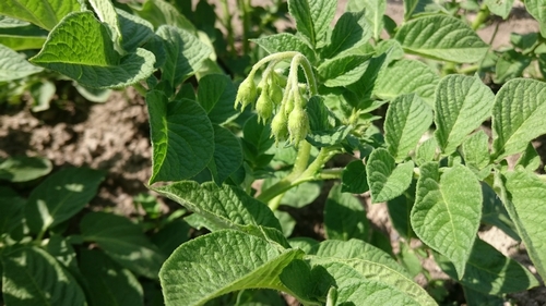 植えてからおよそひと月でジャガイモに花の蕾が付いていました。