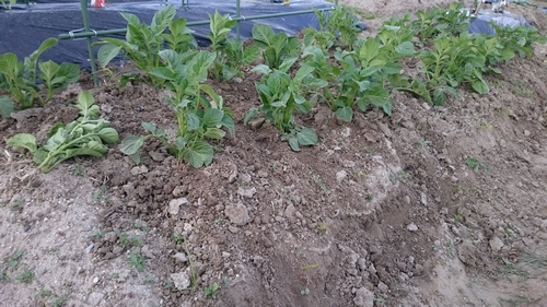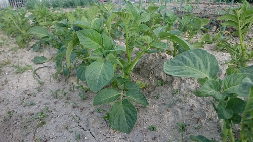 ジャガイモの芽欠きと土寄せ。 ジャガイモの芽が20センチを超え、そろそろ芽欠きと土寄せの頃合かと思っていたのですが、数株しか芽が4本以上出てなかったので迷った末、4本を3本に芽かきをしてから軽く肥料を入れ、土寄せをしました。 あまり変わりがないですね。 そしてこちらがスイカです。 本葉の数が増えてきたので、こちらはそろそろ摘芯かも。 PR