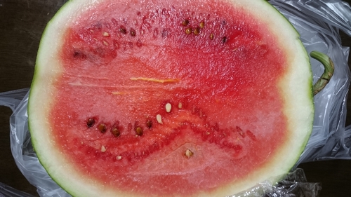 スイカの収穫。 四国では梅雨明けが発表されました。 晴れて気温が高い日もありましたが、梅雨らしい蒸し暑く不安定なお天気も多かった気がします。 受粉してから40日ちょっと経ったので、大玉スイカ「縞王」を収穫してきました。 スイカは水を少なめにした方が美味しくなるとの事で、全くと言っていいほど水やりは行いませんでした。 こちらが収穫したスイカの断面図です。 若干皮と赤い可食部との間の白い部分が多い気もしますが、味は甘く美味しかったです。 ほとんど手間無く育つので、葉っぱが茂って場所をとる事や、一株からあまり実は付けられないことを納得の上育てるのなら、お勧めの植物です。 弊社では大玉スイカを一気に切ることができる、刃渡りが34cmのスイカ包丁を取り扱っております。 製品情報はこちら。 PR