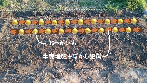 畝づくり+ジャガイモの植え付け。 見よう見まねで作った畝です。 それっぽくなってるでしょうか。 まず最初に植えるのはジャガイモ。 種イモはピルカとデジマを用意しました。 ジャガイモは生育途中に土寄せが必要なので「畝幅30~40cmの一条蒔きで!」という指導が入りましたが、限られた農地のためちょっと冒険をして、 ・畝幅:約110cm ・二条蒔き ・千鳥植え で植えてみました。 写真を撮るのを忘れたので、以下がイメージ図です。 株間は約25~30cmで、その間に芋に触れないよう牛糞堆肥とぼかし肥料を入れてみました。 上手く育つといいのですが。 松山ではしばらく雨が続く予報です。 PR