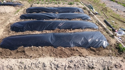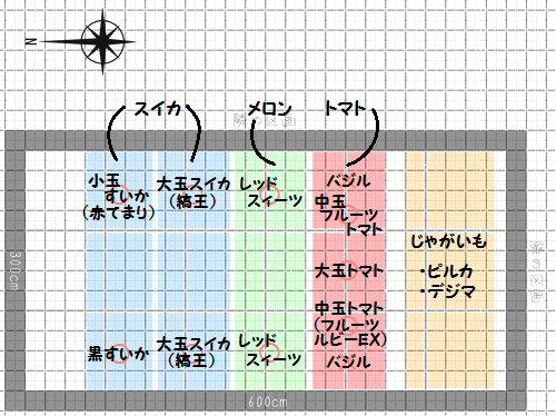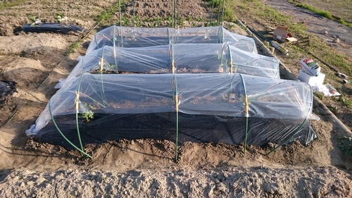 苗植え。 GWが始まりましたが、松山では若干風が強いもののお天気に恵まれています。 早植えは失敗の元だと散々言われていましたので苗の移植を待っていましたが、最低気温が15度を超えるようになってきたので本日夏野菜を畑に植えてきました。 まずは黒マルチを張るんですが、風が強くてなかなか大変でした。 そしてトマト用の支柱、手前にはトンネル支柱とビニールを。 これも指導を受けて、高温障害にならないように下の方はビニールを覆っておりません。 今のところ下の図のように植えています。 PR