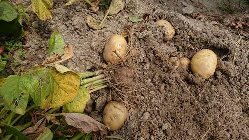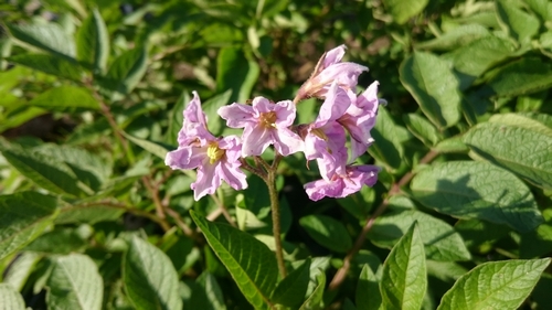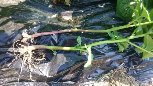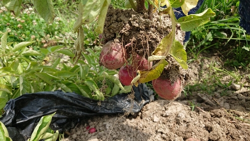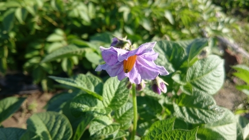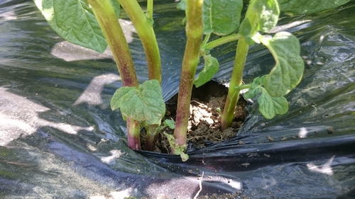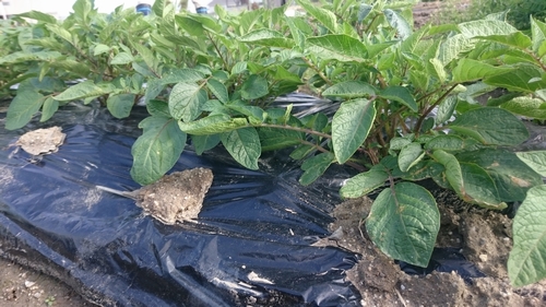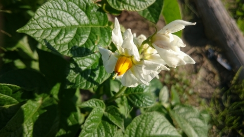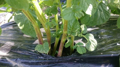 ジャガイモの芽欠き・花。 ジャガイモの茎がだいぶ乱立しています。 そのまま育てると小芋になると言われますが、どうやら一概にそうとは言えず品種や株間・畝間・肥料によるところもある模様。 今年は教科書通りの2~3本立てにはこだわらず、目についた茎が細かったり生育が思わしくないようなものを気持ち欠くだけにしてみました。 なんだかスッキリしました。 欠いた芽にはすでにジャガイモっぽいものが。 さて上に目を向けると花が咲いていました。 こちらは「アンデスレッド」。 これが「ピルカ」。 そして「とうや」です。 それぞれ花の色・形が違っているので、じゃがいもは「この品種はどんな花が咲んだろう」と楽しみな野菜です。