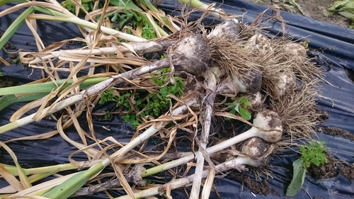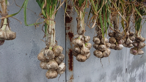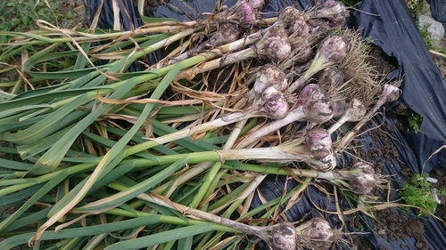ニンニクの収穫。 お天気がやっと続いてくれたので、ニンニクを収穫してきました。 こちらがホワイト六片。 そしてこちらが紫ニンニク。 ホワイト六片は球太りもよく良い感じです。 紫ニンニクは球割れがちらほら見受けられました。 ホワイト種より生育が早い品種で収穫が遅れたのか、収穫時期に雨が多かったので水分に弱い品種なのか・・・。 いづれにしてもホワイト種に比べて若干育てるのにコツが要りそうです。 収穫したニンニクは軒下で干しています。 しかし四国地方は今日から梅雨入り・・・。 本当にギリギリの収穫タイミングでした。
