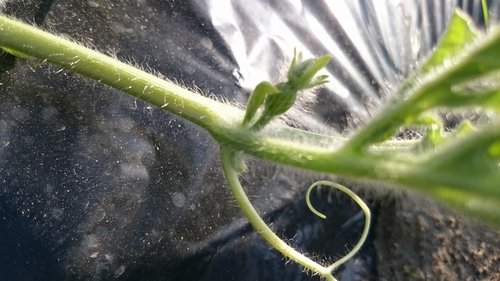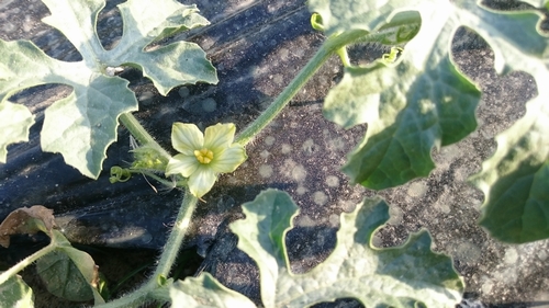 スイカの花。 スイカにも花が咲いていました。 雄花が咲いているのは直ぐにわかったのですが、摘芯する際にツルをよく観察をしていると雌花もついていました。 しかし一番花は摘み取るのがセオリーらしいので、株の成長とこれからつくであろう雌花のために摘んでおきました。 小玉スイカに比べ、大玉スイカの「縞王」は樹勢が凄いです。 子ヅルが畝からはみ出て散らかってしまいがちです。