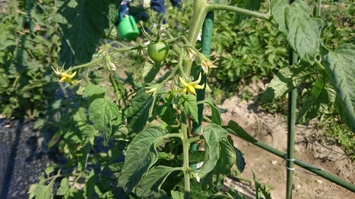 トマトとメロン。 大玉トマト、トマトトーンは使わずじまいでしたが無事受粉をし、実がついていました。 それにしても、いつもトマト栽培で1本立ちや3本立ちにしようとするのに、知らず知らずの間に脇芽が育って花をつけてしまいます。 小まめに脇芽欠きをしているつもりなのですが、なかなか上手くいきません。 こちらはメロンの雌花です。 スイカに続き、メロンにも雌花が咲きました。