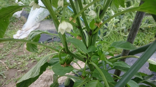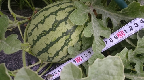 スイカ成長中。 大玉スイカ「縞王」、順調に育ってきています。 受粉からおよそ1週間で直径20センチほどにまで成長していました。 まだまだ先は長いので、カラスなどに狙われずに育って欲しいものです。 そしてこちらはピーマン。 花も咲き、下の方にはピーマンの実も付いています。 こちらも順調です。 松山地方も梅雨に入り、一日中カンカン照りという日があまりありません。 過ごしやすいですが、植物のために太陽も欲しかったり。