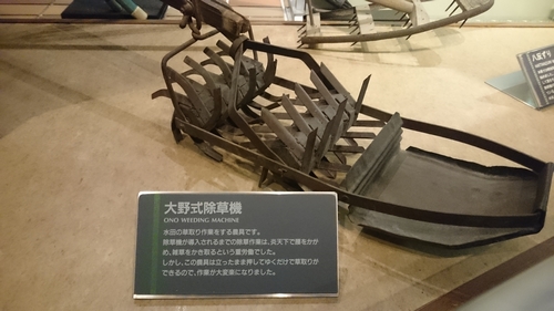 愛媛県総合科学博物館。 愛媛県総合科学博物館です。 円錐形のエントランスが特徴的な、プラネタリウムが併設された立派な施設です。 恐竜の骨格をはじめ、様々な標本、ユニークな展示物が並べられているのですが、その中に次のような展示物がひっそりと置かれていました。 「大野式除草機」です。 弊社の初代・秀吉が、兄弟二人と共に作成した物らしいです。 このように展示されているのを見ると、感慨深いものがあります。 PR