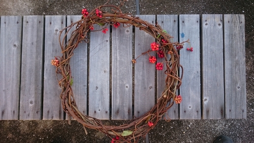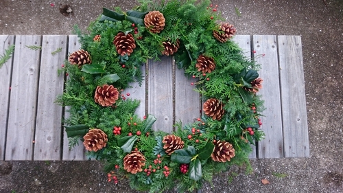 枯れる心配が無く、手入れや片付けが簡単な造花のリースも売っていますが、手作りで生花を使って作ると愛着が湧くとともに、森の中のような青い匂いが漂ってきて凄く良いですよ。