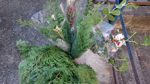 常緑樹の葉っぱや赤い実などがあれば何でもいいんですけど、今回使ったのはヒノキ、薩摩杉、コニファー、バラの実、クリスマスホーリー、松かさです。