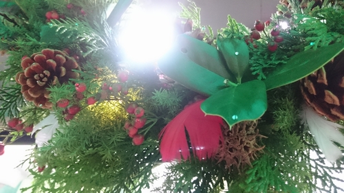 これだけでも十分リースとしては面白いと思うのですが、クリスマスっぽさはあまりないので飾り付けを始めます。