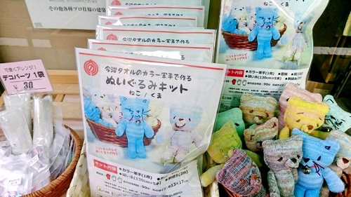 新商品!「今治タオルのカラー軍手で作るぬいぐるみキット(ねこ/くま)」 試行錯誤の末、新商品の発売となりました。 その名も「今治タオルのカラー軍手で作るぬいぐるみキット(ねこ/くま)」です! そのままの商品名ですが、当店の名物商品「今治タオルの残り糸で織ったカラー軍手」を使ってぬいぐるみを作ってしまえるというキットです。 キット内容は、カラー軍手(1枚)、型紙、綿、縫い糸、刺繍糸が入っており、針・はさみ・ペンがあれば直ぐに作り始められるものになっております。 是非秋の夜長に、また芸術の秋でもありますので、ご自分だけの一体を作ってみてはいかがでしょうか? オンラインショップでの販売に先駆けまして、店頭でのワゴンにて販売を開始いたしました。 見本として様々な表情の子達がワゴンで待っております。 デコパーツも様々ご用意しておりますので、可愛く着飾ってあげてください♪ また、ワゴン横にて今治タオルのカラー軍手(1組入)も販売しておりますので、お好きな色を選んでいただき3体・4体・10体と沢山作っていただけます。 オンラインショップでの取り扱いは今しばらくお待ちくださいませ。 販売開始時にはFacebookでお知らせさせていただきます。